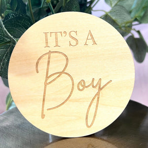 Our "It's a Boy/ It's a Girl" natural wood, beautifully engraved birth announcement discs are double sided with "It's a Boy" engraved on one side and "It's a Girl" engraved on the other. The perfect way to make some of your first photos of baby that little bit more special and great if the gender of your baby is a surprise or if you want to use it more than once!