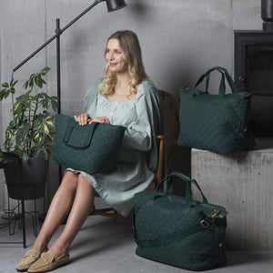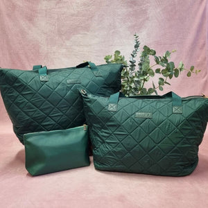Super lightweight and very strong, these bespoke, water resistant, quilted bags are perfect for trips away from home, whatever the reason. In a gorgeous dark green with dark green handles and trims, a matching set of the Ulluv Signature bags is the ultimate in style and sophistication!