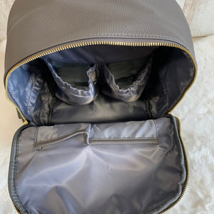 Our Saoirse backpack is made in the softest of PU leather and comes in four colourways - soft pink (a lovely baby pink), smoke grey (a stunning browny grey), black and sage green. It has 8 pockets in total (3 external and 5 internal) including 2 inside insulated bottle pockets.
